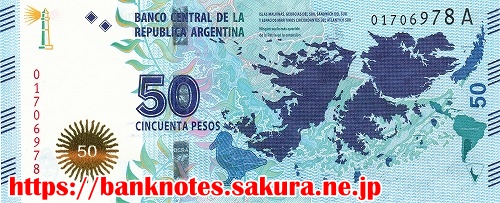 表面には、アルゼンチンが現在も領有を主張しているフォークランド諸島と紛争時に同国の海兵隊が約3週間占拠したサウスジョージア・サウスサンドウィッチ諸島の地図が描かれています。裏面には、1833年の大英帝国のフォークランド侵攻に半年以上抵抗した英雄アントニオ・リベロが描かれています。裏面左側には「ダーウィン墓地」が中央下には「戦艦ベルグラーノ号」が描かれています。