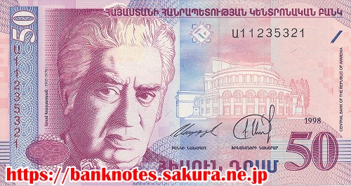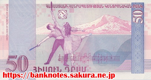 歴史上最初のキリスト教国家のアルメニアです。表面の肖像はアルメニアが生んだ世界的作曲家「ハチヤトリアン」です。裏面の山は、ノアの箱舟が流れ着いたとして有名な『アララト山』です。アルメニア民族の象徴となっています。中央で踊っているのは、ハチヤトリアンが作曲した「ガヤーネ」の中の「剣の舞」のシーンです。