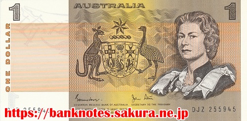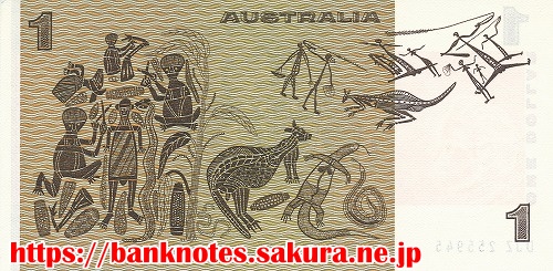 1974年から1983年まで発行された1ドル紙幣です。表面中央には、カンガルーがデザインされた国章が描かれています。裏面には、先住民アボリジニーの絵が描かれています。