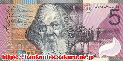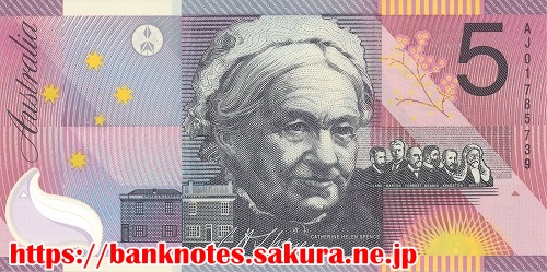 | 2001年1月に建国100年を記念して発行された「記念5ドル」のポリマー紙幣です。表面の肖像は、建国の父といわれるヘンリー・パークス(Sir Henry Parks 1815-1896 ) です。肖像のほかに、最初のオーストラリア議会の開会式の光景、シドニーの連邦パビリオンの建物、メルボルンの王立展示場、パークスの有名な演説が行われた美術学校と彼の演説内容、国章、パークスのサインなど狭い券面に盛りだくさんの内容が描かれています。裏面の肖像は、社会改良家、小説家で、最初の連邦議会の女性立候補者であったキャサリン・ヘレン・スペンス ( Catherine Helen Spence 1825-1910 ) が描かれています。歴史所有名な6人の人々の小さな立像、連邦子供局の建物、太陽の光、南十字星、アカシアの枝を使った編み枝細工、スペンスのサインなど、多くのテーマが詰め込まれています。 |