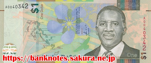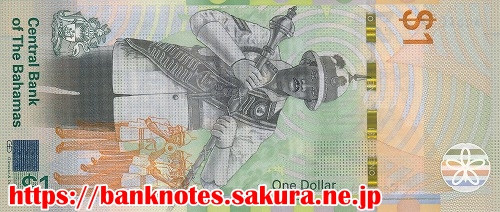 表面の肖像は、前首相「ピンドリング Sir LYNDEN O. PINDLING 」です。1967年から1992年まで政権を担当したが、麻薬売人からの賄賂疑惑により支持率が低下し、政権交代になりました。2000年8月に前立腺癌により死亡しています。首相在任中の1973年にイギリスからの独立を達成したことでその功績が評価されています。裏面には、警察音楽隊が描かれています。この紙幣はドイツのギーゼッケ社により印刷されています。