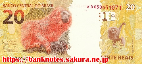 2010年版の新デザイン20レアル紙幣です。裏面は以前からと同じ、アマゾンの熱帯雨林に棲息し、推定棲息数僅か400頭と見られている「ゴールデン・ライオン・タマリン」が描かれています。タマリンはマーモット(キヌザル)科の哺乳類で、全身が金色の毛に覆われ、頭部と肩にライオンのような鬣が生えているところから名付けられています。