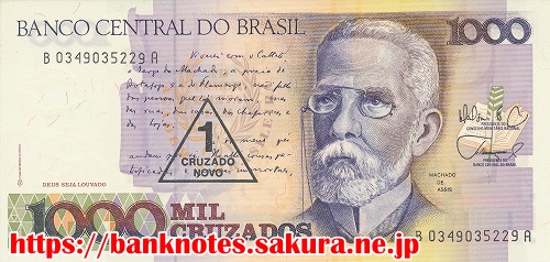 表面の肖像は「マシャード・デ・アシス Machado de Assia (1839-1908) 」です。ブラジルにおける叙述小説のスタイルを創造、確立。ブラジル文学史上最高の作家といわれる。写実主義、自然主義、ロマン主義小説家。1897年にはブラジル文学アカデミーの初代会長に就任。紙幣裏面には、リオ・デ・ジャネイロの街並みが描かれています。