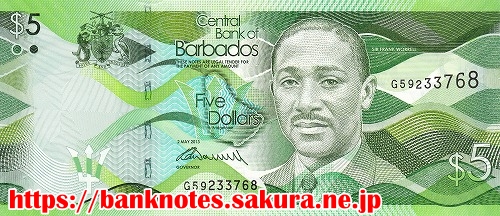 表面の肖像は「フランク・ウォレル Sir Frank Worrell (1924-1967) 」です。バルバドス・ジャマイカ・西インド諸島で活躍したクリケット選手でナショナル・ヒーローになった人物です。裏面には西インド諸島大学 バルバドスキャンパス University of West Indies at Cave Hill のクリケット場 3Ws Ovalが描かれています。