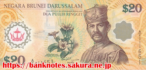 との「通貨の等価交換協定」40周年を記念して発行された、裏面のデザインが共通の「記念紙幣」です。この協定により、シンガポールとブルネイの通貨は手数料なしで等価に交換されています。表面の肖像は、第29代「ハサナル・ボルキア国王 Sultan Hassanal Bolkiah (1946- )」です。中央には協定のシンボルである薬草が描かれています。