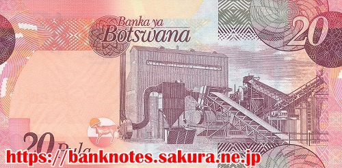 表面の肖像は、国歌を作曲した「Dr. Kgalemang Tumediso Motsete」です。裏面には工場らしき建物が描かれています。