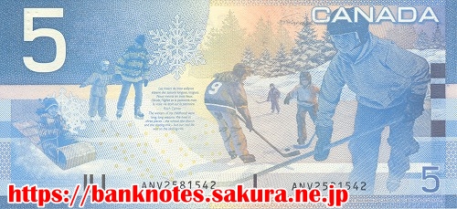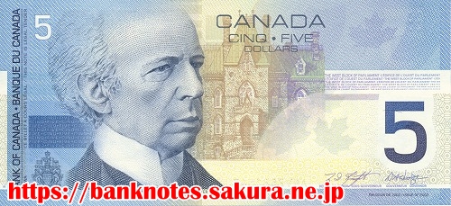 2002年から新デザインとなった5ドル紙幣です。表面の肖像は「ウィルフレッド・ローリエ Sir Wilfrid Laurier (1841-1919) 」です。フランス系カナダ人としてケベック州で強い支持を受け、1896-1911年までフランス系としては初めて第7代首相を務めています。裏面はカナダらしく、スケート・そり・アイスホッケーをする子供たちが描かれています。