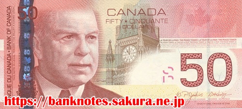 | 表面の肖像は「ウィリアム・ライアン・マッケンジー・キング William Lyon Mackenzie King (1874-1950) 」です。裏面には、アルバータ州の"Famous Five"(著名な5人)と、ケベック州の元議員で人権に関する政治活動家であった「テレーズ・カスグラン Therese Casgrain (1896-1981) 」が描かれています。1951年最初の女性党首になったカスグランは消費者権利、女性の権利、世界平和、社会的な正義のため生涯キャンペーンを続けた人で、彼女にちなんだボランティア賞が制定されています。 |