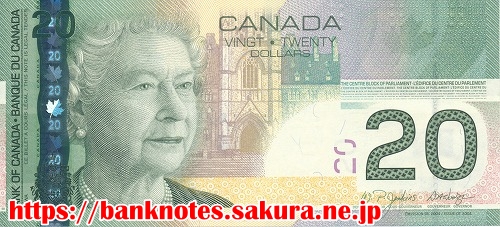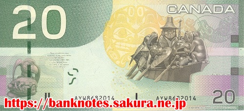 表面の肖像は「エリザベス女王」です。最近のかなり高齢の肖像です。裏面にはハイダ族を代表する「ビル・リード Bill Reid (1920-1998)」の彫刻作品が描かれています。