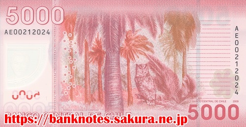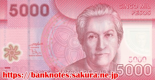 表面の肖像は、女流詩人で1945年にノーベル文学賞を受賞した「ガブリエラ・ミストラル Gabriela Mistral(1889-1957)」です。裏面にはラ・カンパーナ国立公園内の椰子の群生とフクロウが描かれています。