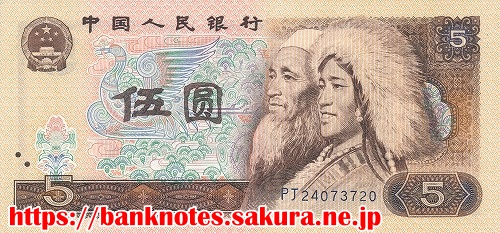 1980年発行の人民元「5圓券」です。表面は、チベット族・回族の肖像です。裏面には、長江・夾峡地帯の風景が描かれています。