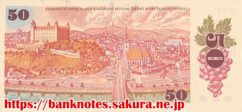 チェコスロバキア時代の1987年に発行された50コルナ紙幣です。表面の肖像は「L.Sturat」です。裏面の街は「ブラティスラバ Bratislava 」です。