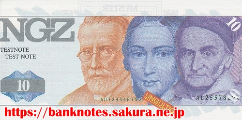 表面の肖像は、右から数学者「カール・フレデリック・ガウス Carl Friedrich Gauss (1777-1855) 」です。中央はピアニスト・作曲家「クララ・シューマン Clara Schumann (1819-1896) 」です。左は医者・細菌学者「パウル・エールリッヒ Paul Ehrlich (1854-1915) 」です。