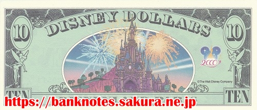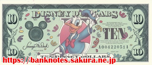 2000年版の10ドル紙幣です。表面の肖像は、ご存知「ドナルドダック」です。この紙幣は、ディズニーランド内で米ドルと同じ価値をもつそうです。