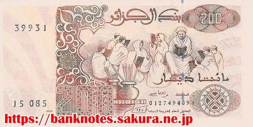 1992年に発行された200ディナール紙幣です。表面には、コーラン学校koranic schoolが描かれています。裏面には、立派なモスクが描かれています。