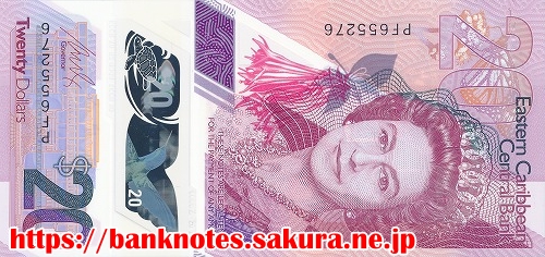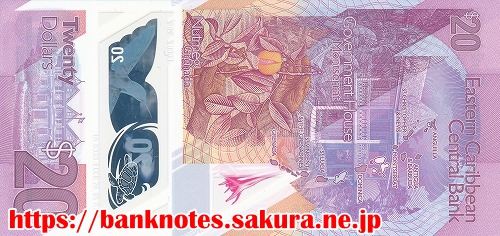 表面の肖像は「エリザベス女王」です。小さくウミガメや魚、ハチドリが描かれています。裏面には、モントセラトのGovernment Houseとナツメグの実が描かれています。