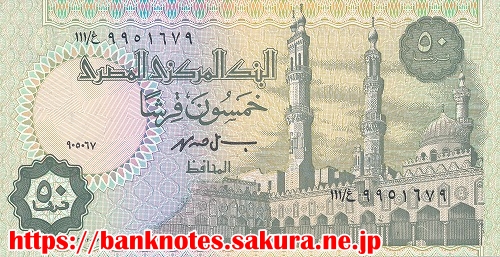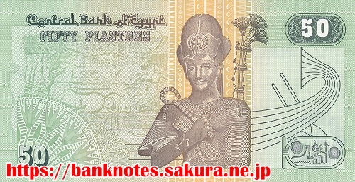 表面はアズハル・モスクです。970年に創られたファティマ朝最初のモスクです。裏面は、ラムセス2世像です。新王国時代第19王朝のファラオ。統治期間は67年間とエジプト史上2番目に長い。エジプ史上最大の支配者であり、カルナック神殿やルクソール神殿など膨大な建築物を残し規模も大きなものです。