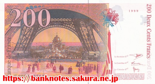 | 表面の肖像は「アレクサンドル・ギュスターヴ・エッフェル Alexandre Gustave Eiffel (1832-1923) 」です。1887年〜1889年にかけて、革命100周年を記念して開催されるパリ万国博覧会のモニュメントとして、鉄骨による巨大な塔を建設しました。これが有名なエッフェル塔です。完成当時は賛否両論だったが、今ではパリを代表するシンボルとなっています。エッフェルは、この塔の建設を請け負った「エッフェル社」の創業者。裏面には、1889年のパリ万博での様子が描かれています。 |
