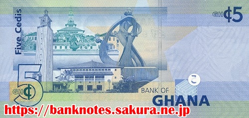 表面には、ガーナの独立に貢献した「ビッグ・シックス」と呼ばれる6人の英雄が描かれています。後列左端が、初代大統領の「クワメ・エンクルマDr. Kwame Nkrumah (1909-1972)」です。中央に独立記念のアーチを描いています。裏面は、ガーナ大学キャンパス内の建物、抽象化した女性像の彫刻が描かれています。