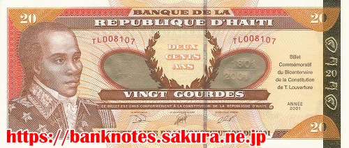 | 憲法制定200年を記念して発行された記念紙幣です。表面の肖像は、独立の英雄「トゥーサン・ルヴェルテューユ Toussaint l' Ouverture (1744?-1803)」です。革命家ルヴェルテューユは本名フランソワ・ドミニク・トゥーサンであり、奴隷の子としてハイチに生まれ、1791年反乱軍に参加し、1797年頃までに彼はハイチ植民地の事実上の支配権を確立して独立を目指したが、その後ナポレオン軍により逮捕され、志半ばにしてフランスで獄死した。この記念紙幣はルヴェルテューユが制定したとされる1801年憲法から200年を経過した2001年に発行されたものです。 |