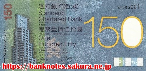 スタンダードチャータード銀行(香港)が、慈善活動目的の創立150周年記念紙幣で発行した紙幣です。紙幣表面は、企業カラーである青と緑でビクトリアハーバーの鳥瞰図を再現しています。左側にはスタンダードチャータード銀行の本社ビルが描かれています。裏面には、ビクトリアピークから湾を見下ろす8人の人物が描かれています。