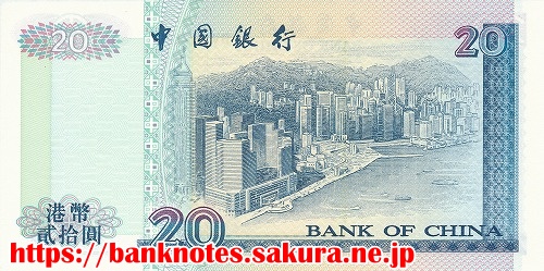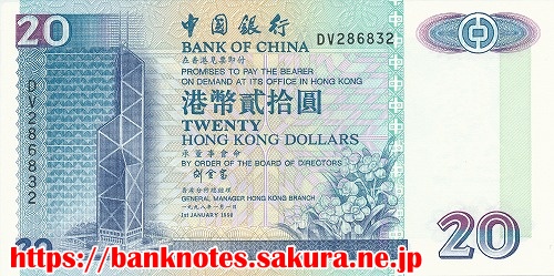 中国銀行発行の20ドル紙幣です。表面には「中国銀行香港分行ビル」と水仙が描かれています。表面には、セントラル地区高層ビル群が描かれています。