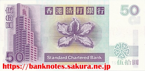 チャータード銀行発行の50ドル紙幣です。表面には「獅子」が描かれています。裏面には、洋紫荊(ハナズオウ)が描かれています。