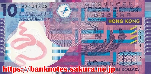 ポリマー製になった「香港特別行政区」発行の紙幣です。図柄は、以前の紙製のものと全く同じです。