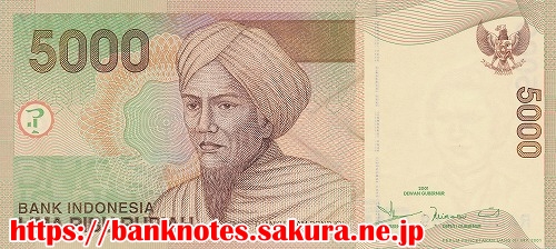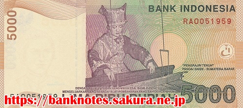 表面の肖像は、立派なあごひげの「イマン・ボンドヨル Tuanku Imam Bondjol (1772-1864) 」です。スマトラ島ミナンカバウ族宗教活動家のリーダーです。裏面には、女性が機織をしている様子が描かれています。説明書きに「 Pengrajin Tenun 」Pandai Sikek - Sumatera Barat.とあります。
