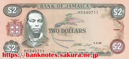 ブルーマウンテンコーヒーとレゲイで有名なカリブの島ジャマイカの紙幣です。表面は国鳥のハミングバードの絵が描かれています。裏面はスクールボーイが描かれています。「Out of Many One People:多数(の人種・民族)からなる一つの国民」というメッセージが描かれています。表面の肖像は、モラント・ベイの反乱を指揮した「ポール・ボーグル Paul Bogle (1825-1865) 」です。