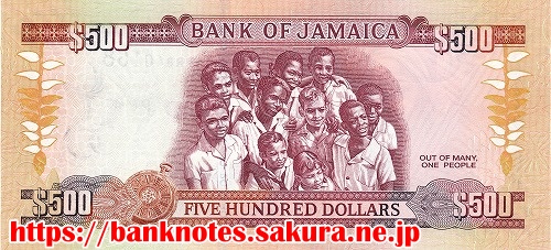 | 表面の肖像は「ナニー・オブ・ザ・マローン Nanny of the Maroons (1700?-1740) 」です。裏面は以前の2ドル紙幣の裏面であったスクールボーイが描かれています。「Out of Many One People:多数(の人種・民族)からなる一つの国民」というメッセージが描かれています。 イギリスからの独立50周年を記念して発行された記念紙幣です。8月6日がジャマイカの独立記念日で祝日になっています。表面の右側には、国鳥ハミングバードの尾で50を表現したマークが描れています。 |