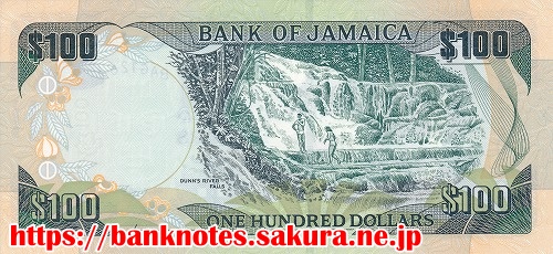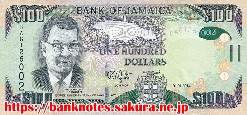 | 表面の肖像は、元首相でモンティゴベイの空港の名前にもなっている「ドナルド・サングスター Donald Sangster (1911-1967) 」です。裏面はジャマイカで一 番の観光スポット「ダウンズリバーの滝登り」の絵です。この紙幣は、ドイツ・ミュンヘンに本社を置く印刷会社「ギーゼッケ アンド デブリエント Giesecke & Devrient 」社製です。ハイブリッド・ペーパーと呼ばれる素材で、今までの紙製やポリマー製との違った素材です。紙の上にコーティングされたような感じです。 |