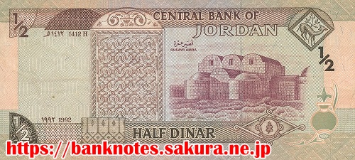 表面の肖像は「フセイン国王」です。アラビア語で全く読めませんが頭のかぶりものがカフィーヤ、二重の輪になっているのがイカールと呼ばれるものだそうです。いかにもアラブの国です。