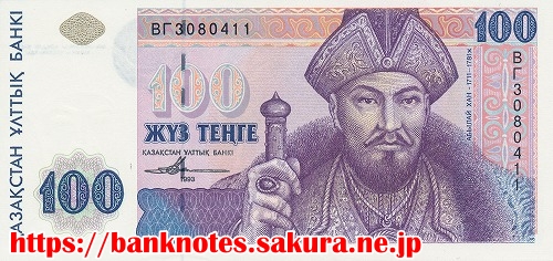 表面の肖像は「アブライ・ハーン Abylai Khan (1711-1781) 」です。18世紀後半に同じホアードに君臨した。清の乾隆皇帝がジュンガルに侵攻しカザフも危機に面した時に、中立を保ち、清のジュンガル平定後は乾隆皇帝に忠誠を誓った。その結果、1771年に清とロシアの双方からカザフの支配者として認められた。