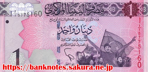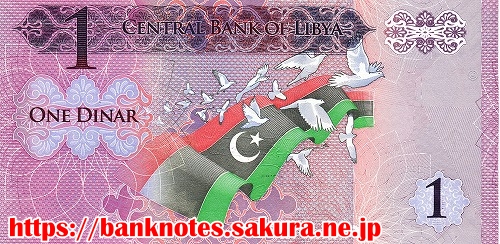 カダフィー体制が崩壊してから、初めて発行された1ディナール紙幣です。表面には、新国旗を掲げてカダフィー体制が崩壊を喜ぶ民衆が描かれています。裏面には、やはり新国旗と平和の象徴「鳩」が描かれています。