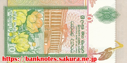 表面には石像らしいものが描かれています。裏面には、鶴?とコロンボにある国会議事堂の建物が描かれています。とてもカラフルな紙幣です。