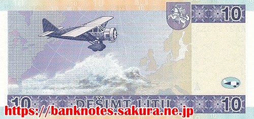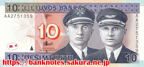 表面の肖像は、左「 ステポナス・ダリウス S. Darius 」右「ステイシス・ギリアス S. Girenas 」です。1933年ニューヨークを飛び立って大西洋を越え6,411Kmを37時間11分かけて横断しています。しかしドイツのソルデインで墜落し死亡しています。裏面にはその時の飛行機「リトアニカ号 Lituanica」が描かれています。