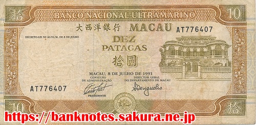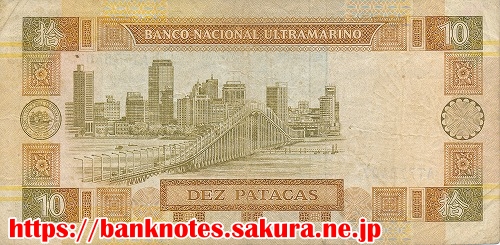東洋のモンテカルロといわれ、観光とギャンブルで知られるマカオの紙幣です。1999年12月20日を期して中国に返還されることになっています。上の紙幣は1990年から発行されているもので、裏面には都市の風景と大きな橋が描かれています。