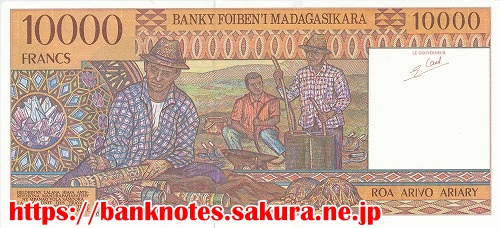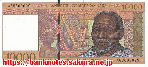 これも色鮮やかな10000フラン紙幣です。5フランが1アリアリとなっており、二つの通貨呼称があります。表面にはなんとも雰囲気のあるおじさんと、民族楽器らしきものが描かれています。裏面には、クラフト製品らしきものを作っている人々の様子が描かれています。