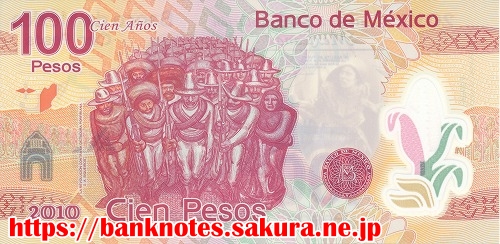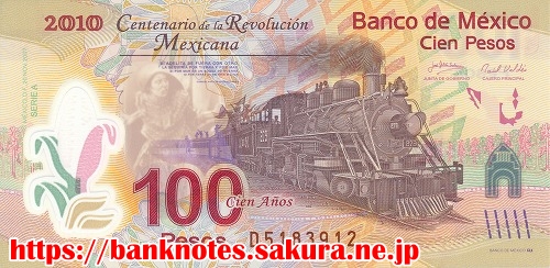 西暦2010年に革命100周年になるのを記念して発行された記念紙幣です。表面には機関車が描かれています。右端には革命記念塔も描かれています。裏面には「ポルフォリズムに対する革命」というシケイロスの壁画が描かれています。