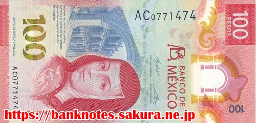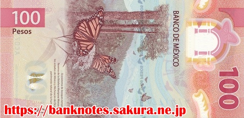 表面の肖像は、メキシコ盆地にかつて存在したテスココ王国の支配者「ネサワルコヨトル NEZAHUALOYOTL (1402-1472)」です。裏面には乱舞する「アゲハ蝶」が描かれています。この紙幣は国際銀行券協会(IBNS)が行う「2020紙幣オブザイヤー」ノミネート紙幣です。