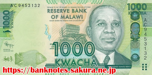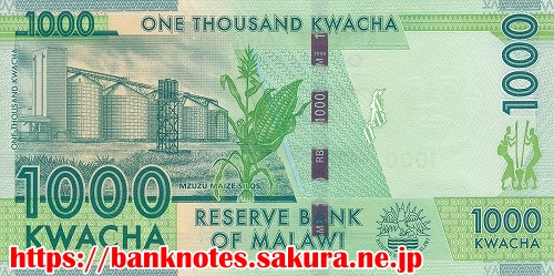 面の肖像は、前大統領「ヘイスティングス・カムズ・バンダ Hastings Kamuzu Banda (1898-1997)」です。裏面は、北部の都市ムズズにあるトウモロコシのサイロが描かれています。