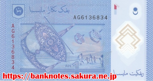 | 2012年7月よりデザイン変更になり発行されたポリマー製の新1リンギット紙幣です。表面の肖像は、初代国王「アブドゥル・ラーマン Abdul Rahman (1895-1960)」です。中央には国花のハイビスカスが描かれています。裏面には、マレーシアの凧(マレー語でWAU=ワウ)が描かれています。この形の凧は特にWAU BULAN(ワウ ブラン)と呼ばれていてます。この解説は、「マレーシアの情報発信地」管理人様から許可をいただき転載させていただきました。有難うございました。 |