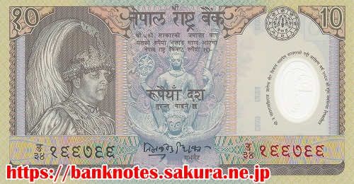 表面の肖像は、第12代国王として即位した「ギャネンドラ新国王」です。2001年6月に起きた宮廷内の事件で、ビレンドラ国王・ディペンドラ皇太子が相次いで死去され急遽即位した新国王の肖像に代わった初めての紙幣です。裏面には、「鹿」のような「インパラ」のような動物が描かれています。