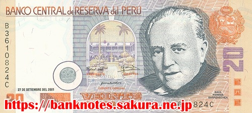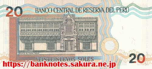 表面の肖像は、歴史学者「 Raul Porras Barrenechea 」です。裏面に描かれている建物は「トーレ・タグレ宮殿 Palacio de Torre Tagle 」です。現在は外務省の建物となっています。