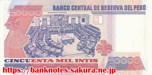 表面の肖像は、政治家「ビクトール・ラ・トーレ Victor la Torre (1895-1979) 」です。ペルーの最大政党(APRA)を創設した人物です。裏面には国会議事堂の内部の様子が描かれています。