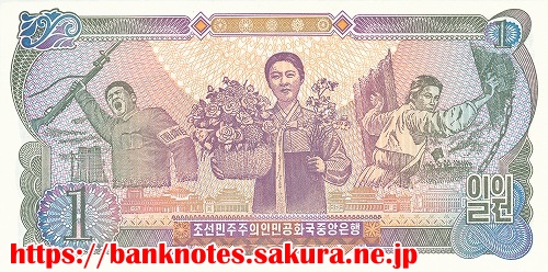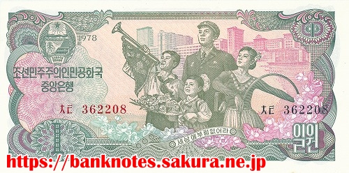 表面には花を持った少女、ラッパを吹く少年、マスゲームらしき少女などが描かれています。裏面には「花篭」を持って民族衣装のチマチョゴリを着た女性、銃剣を持った男性などが描かれています。1978年当時の北朝鮮をよく現しています。