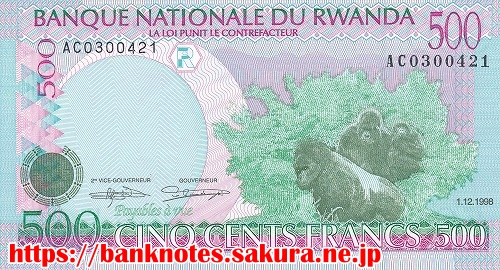 1999年5月から発行された新500フラン紙幣です。表面には、ルワンダの山岳地帯に棲息している最大の霊長類マウンテン・ゴリラのオス、メス、子供の親子三匹が描かれています。そのうち手前のオスは、体重が180キロにもなる巨体を持ち、背中が白いシルバー・バックとなっています。裏面には三角屋根が並んだ同国第二の都市ブタレの国立美術館を背景に、教科書を広げて学習する三人の小学生が描かれています。