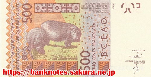 2012年発行の小型の500フラン紙幣です。表面には、タブレット端末が描かれています。裏面には可愛らしい「カバ」が描かれています。