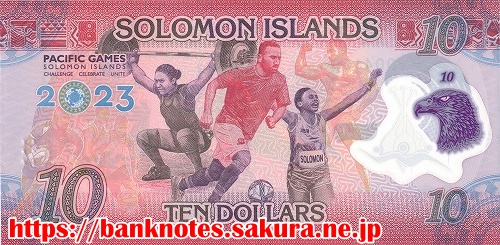 2023年にソロモン諸島の首都ホニアラを会場に開催されたパシフィックゲームズ(Pacific Games)を記念して発行された紙幣です。裏面には、重量挙げ、サッカー、陸上競技の選手たちが描かれています。